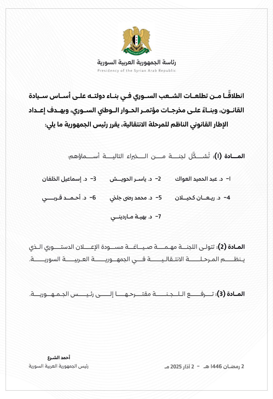 أعلنت الرئاسة السورية للمرحلة الانتقالية اليوم الأحد، تشكيل لجنة مؤلفة من 7 أشخاص لصياغة مسودة الإعلان الدستوري في البلاد.