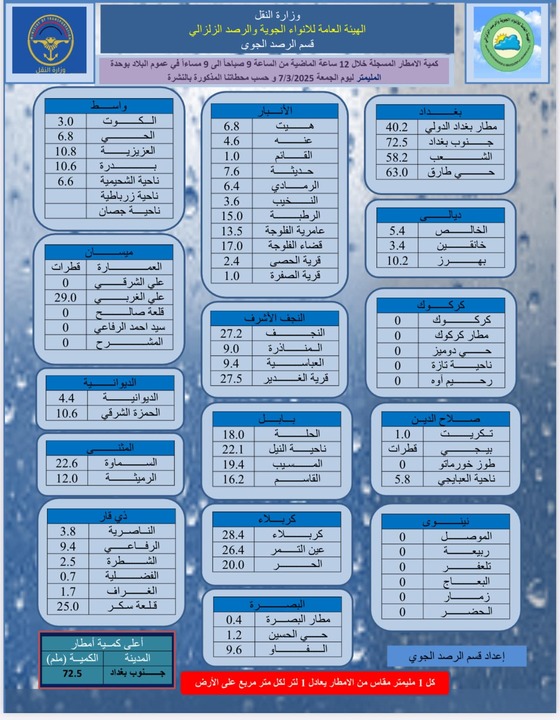 وفي غضون ذلك نشرت الهيئة التقرير الجوي حول كمية الأمطار المسجلة خلال 12 ساعة الماضية من الساعة 9 صباحاً إلى الـ9 مساءً في عموم البلاد بوحدة المليمتر، جاءت كالتالي: