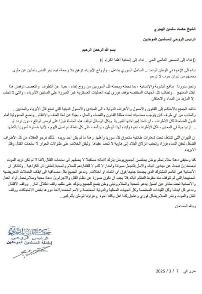 الشيخ الهجري طالب أيضًا بوقف الحملات التحريضية الممنهجة التي لم تتوقف منذ سقوط النظام السابق، مؤكدًا على ضرورة أن يكون الجميع دعاة محبة وسلام، يحملون لواء العدل والإنسانية، ويبنون وطنًا يتسع للجميع. واختتم بيانه بدعوة كافة الجهات المحلية والدولية المختصة، بما في ذلك الأمم المتحدة، للتدخل الفوري والعاجل لفض الاشتباكات ووقف القتل ونشر السلام، مؤكدًا أن الجميع أهل وإخوة، ومعربًا عن ألمه العميق لما يحدث في الوطن.