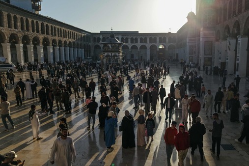 في باحة الجامع الأموي في دمشق، كما في ساحة نصب الجندي المجهول القريب من قصر الشعب في منطقة قاسيون، أدى آلاف السوريين الإثنين صلاة عيد الفطر، للمرّة الأولى منذ الإطاحة بحكم بشار الأسد.