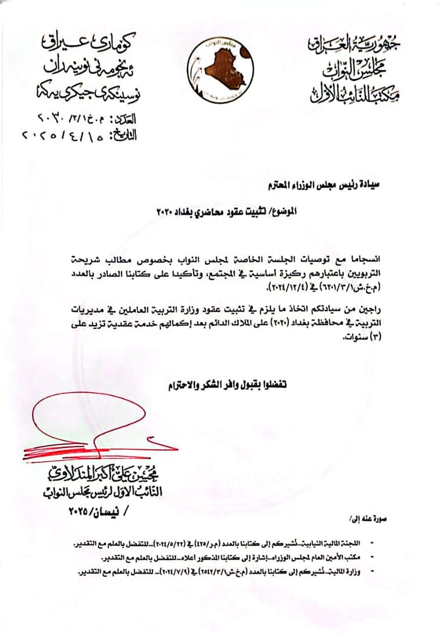 طالب النائب الأول لرئيس مجلس النواب العراقي، محسن المندلاوي، مجلس الوزراء الاتحادي، وبشكل رسمي، بتثبيت عقود محاضري وزارة التربية العاملين في مديريات بغداد لعام 2020 على الملاك الدائم.
