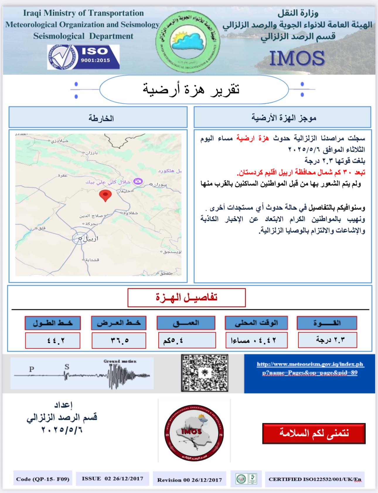 أعلنت الهيئة العامة للأنواء الجوية والرصد الزلزالي في العراق، اليوم الثلاثاء (6 أيار 2025)، تسجيل هزة أرضية بقوة (2,3) درجات شمالي أربيل.