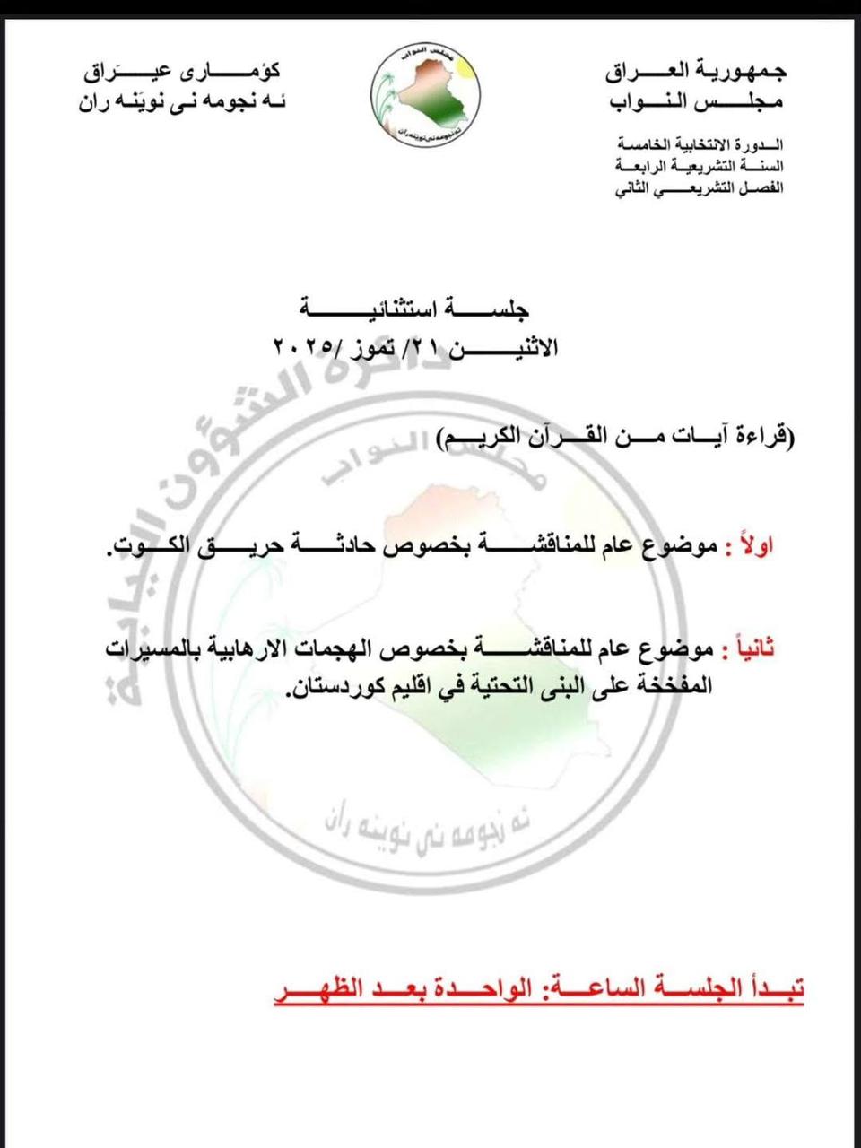 من المقرر أن يعقد مجلس النواب العراقي، يوم الاثنين المقبل، جلسة استثنائية خصصت لبحث فقرتين، إحداهما مناقشة الهجمات الإرهابية على البنى التحتية في إقليم كوردستان.