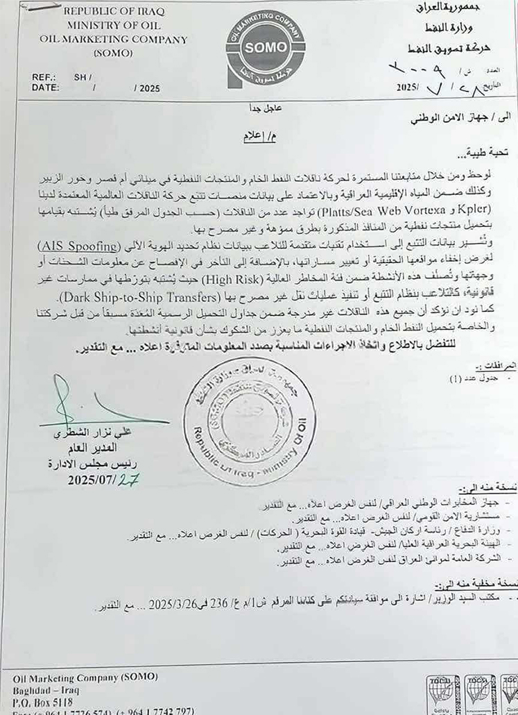 أظهرت رسالة رسمية بتاريخ أمس الأحد أن شركة تسويق النفط العراقية (سومو) حددت عددا من الناقلات المشتبه في قيامها بتحميل منتجات نفطية دون سند من القانون من ميناءي أم قصر وخور الزبير.