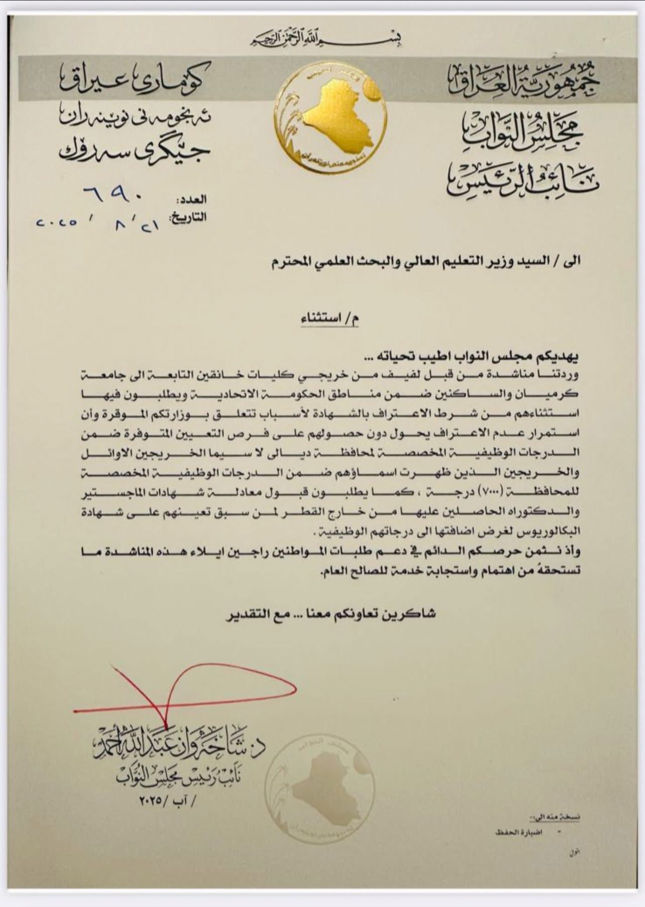كما زار عبدالله خيمة المعتصمين لخريجي وطلبة جامعة گرميان وكليات خانقين، واسمتع، وفق بيان صادر عن مكتبه الإعلامي، إلى "مشاكلهم ومطالبهم المشروعة"، ووعد بتوجيه كتاب رسمي لمخاطبة وزارة التعليم العالي في الحكومة الاتحادية من أجل "حسم ملف الاعتراف بالشهادات للخريجين في مناطق المادة 140 وتوحيد الشروط والتعليمات بين كافة جامعات العراق".