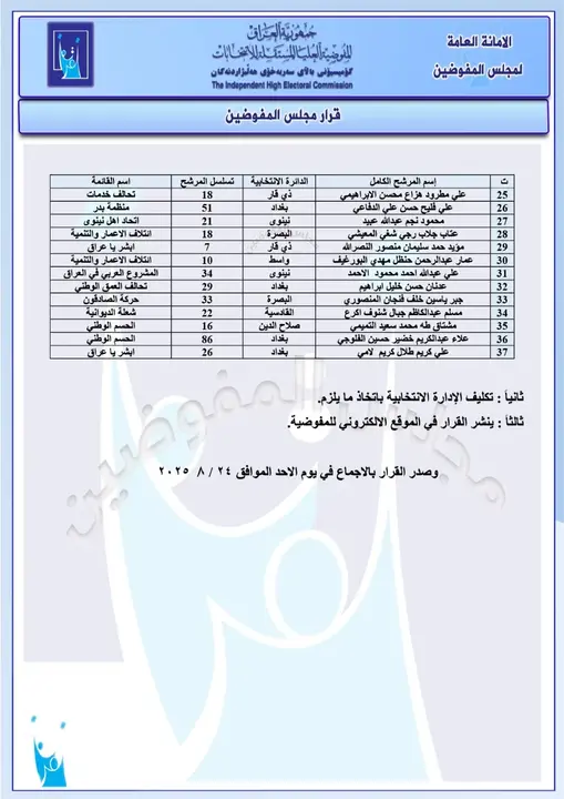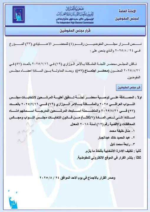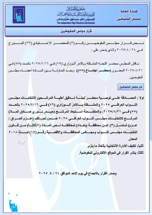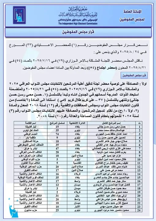 أعلنت المفوضية العليا للانتخابات اليوم الأحد (24 آب 2025) أسماء وجبة جديدة من المرشحين المستبعدين من الانتخابات النيابية المقبلة، من بينهم القيادي في تحالف العزم حيدر الملا ومحافظ كركوك السابق راكان الجبوري لمخالفته المادة (السابعة/ ثالثاً) من قانون انتخابات مجلس النواب ومجالس المحافظات والأقضية.