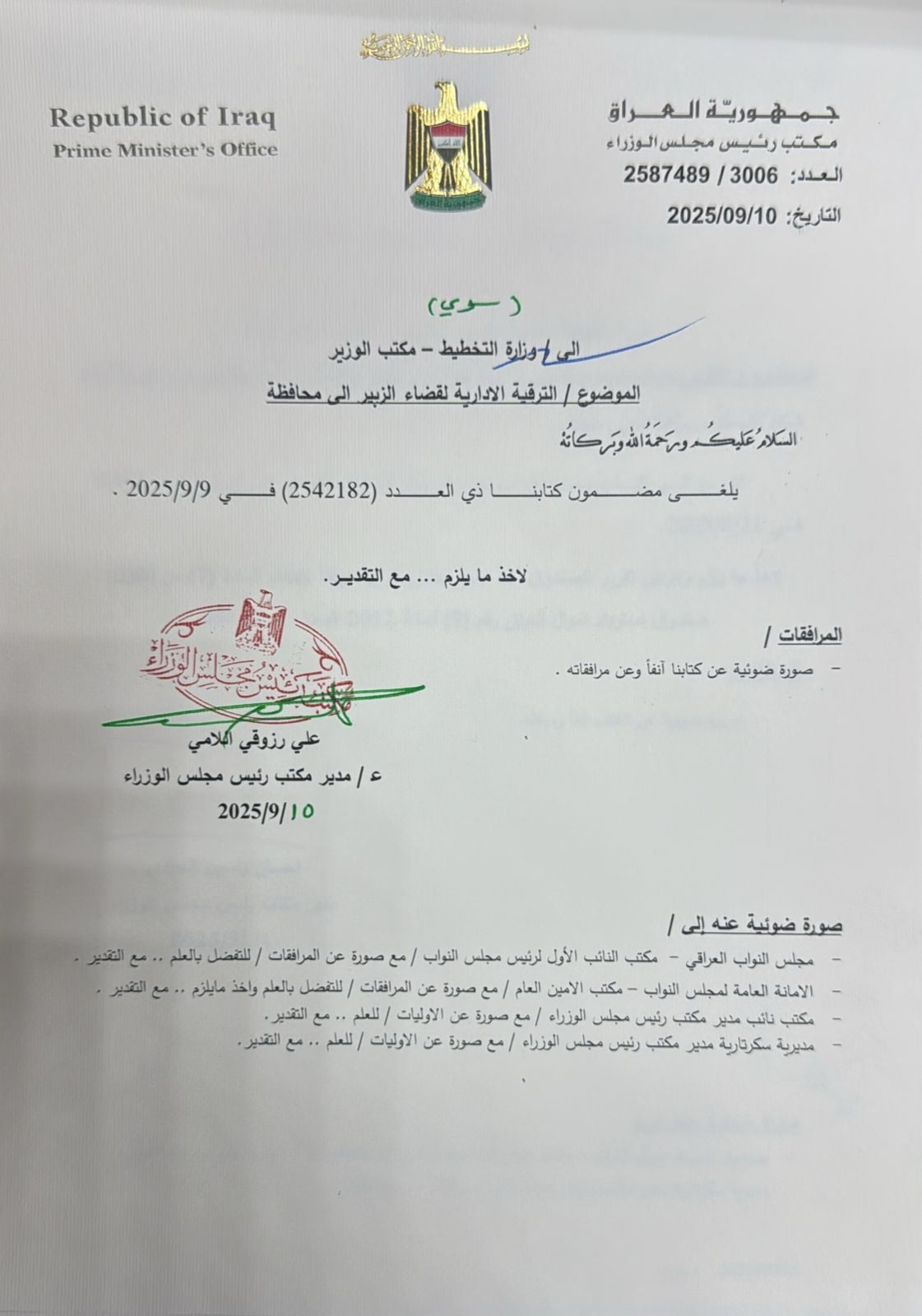 لكن بعد يوم واحد، صدر كتاب جديد من مدير مكتب السوداني، علي اللامي بإلغاء مضمون الكتاب السابق الخاص بالترقية الإدارية لقضاء الزبير إلى محافظة.