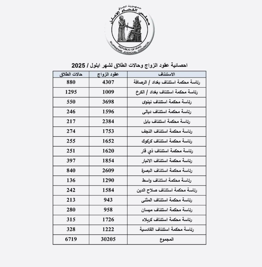 أعلن مجلس القضاء الأعلى، اليوم الأحد (19 تشرين الأول 2025)، إحصائية الزواج والطلاق لشهر أيلول الماضي من سنة 2025، مشيرًا إلى أن عدد عقود الزواج في محاكم البلاد كافة، باستثناء إقليم كوردستان، بلغ 30205 عقود، فيما بلغ عدد حالات الطلاق 6719 حالات.