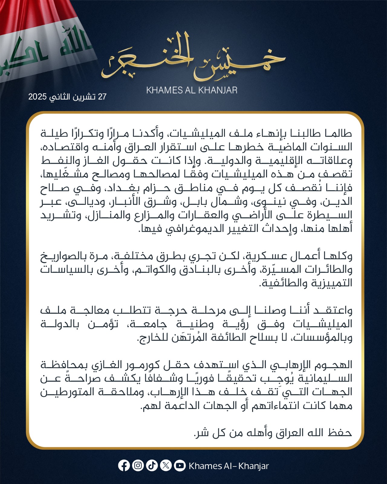 الخنجر أشار إلى أن "الهجوم الإرهابي الذي استهدف حقل كورمور الغازي بمحافظة السليمانية يُوجِب تحقيقاً فورياً وشفافاً يكشف صراحةً عن الجهات التي تقف خلف هذا الإرهـاب، وملاحقة المتورطين مهما كانت انتماءاتهم أو الجهات الداعمة لهم".