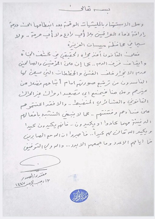 جاء ذلك بحسب وثيقة موقعة بخط يده تعليقاً على الأحداث في محافظة ميسان.