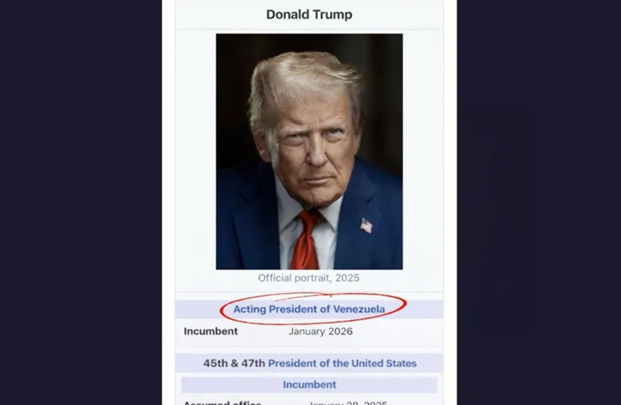 وفي تطور لافت، نشر ترامب صورة له من ويكيبيديا تحت عنوان "رئيس فنزويلا بالوكالة"، ملمحا بسخرية إلى شرعية ديلسي رودريغير، نائبة الرئيس نيكولاس مادورو، والتي تولت زمام السلطة بعد اعتقاله وزوجته في الثالث من شهر كانون الثاني الجاري، على يد قوة أمريكية خاصة.