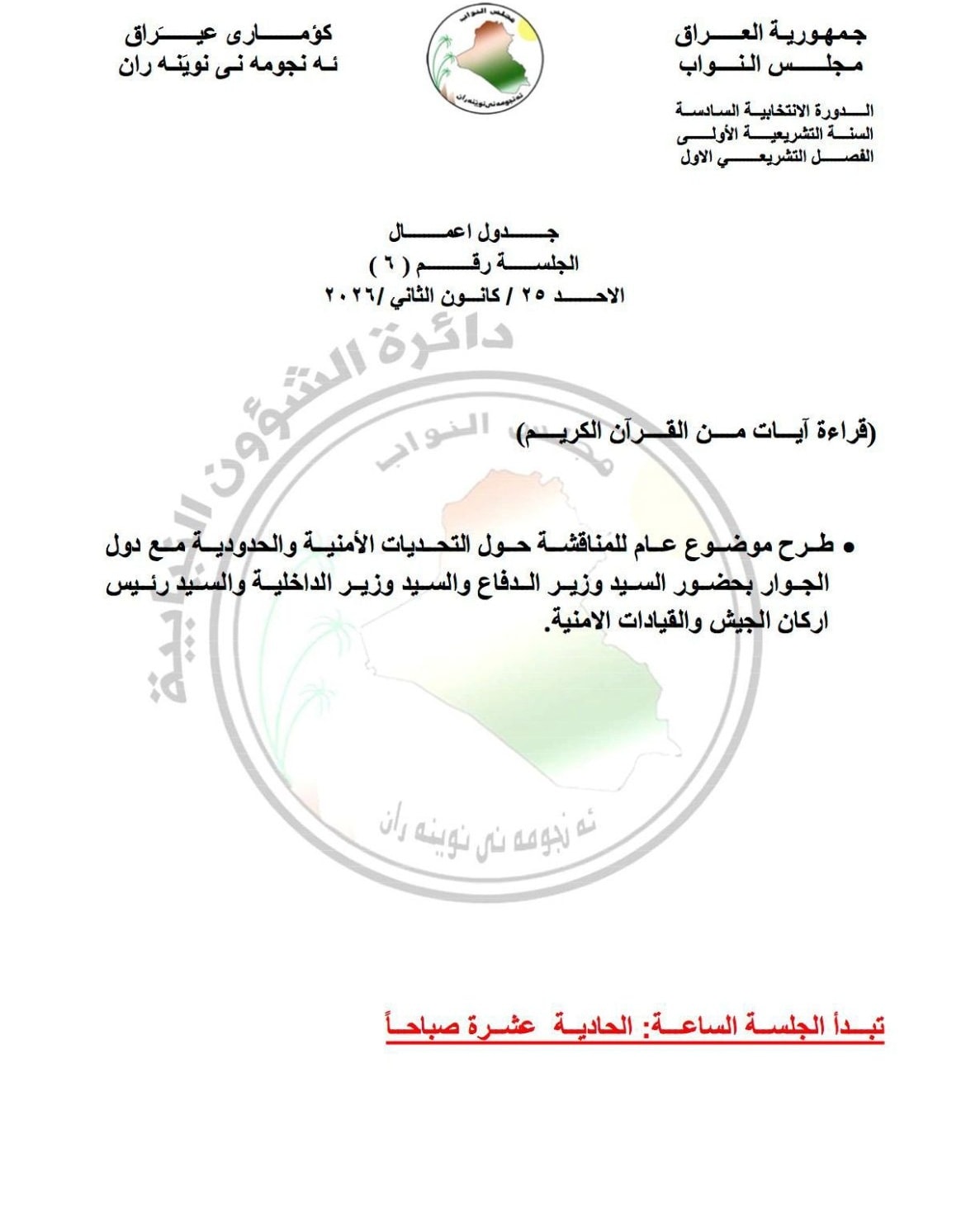 جاء ذلك ضمن جدول أعمال الجلسة السادسة في الدورة الانتخابية السادسة/ السنة التشريعية الأولى/ الفصل التشريعي الأول المقرر عقدها بعد غد الأحد، 25 كانون الثاني 2026، والصادر عن الدائرة الإعلامية لمجلس النواب.