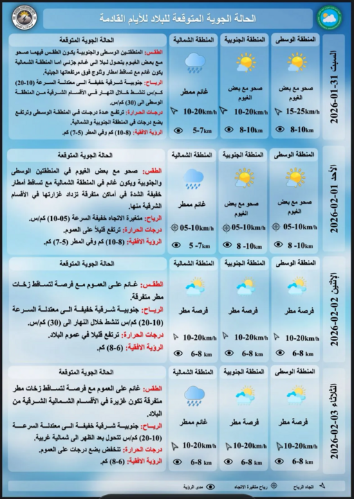 توقعت هيئة الأنواء الجوية، اليوم الجمعة (30 كانون الثاني 2026)، هطولات مطرية متفرقة وارتفاعاً في درجات الحرارة خلال الأيام القليلة المقبلة.