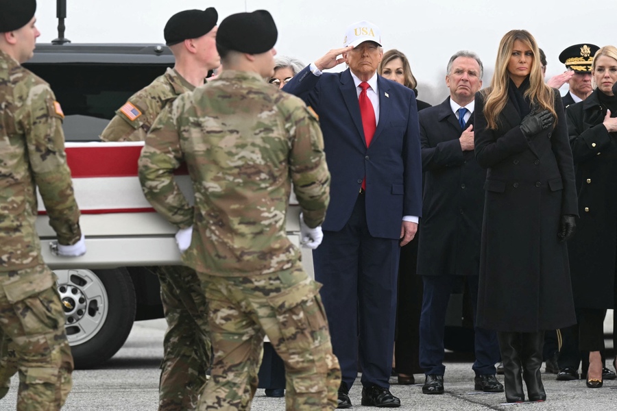 ووضع الرئيس قبعة بيضاء تحمل أحرف "يو إس إيه" مذهّبة، وأدى التحية العسكرية مع مرور النعوش المغطاة بالعلم الأميركي ونقلها من طائرة عسكرية إلى مركبة.