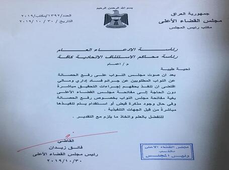 وذكر بيان صادر عن المركز الإعلامي لمجلس القضاء الأعلى أن "مجلس القضاء الأعلى اصدر إعمام لكافة المحاكم بتنفيذ اجراءات التحقيق مع النواب المطلوبين عن جرائم الفساد المالي والإداري دون الحاجة الى مفاتحته بغية مفاتحة مجلس النواب بخصوص رفع الحصانة". وذلك بعد ان صوت مجلس النواب على رفع الحصانة عن النواب المطلوبين عن جرائم الفساد المالي والإداري.