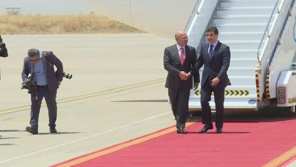 استقبل رئيس اقليم كوردستان نيجيرفان بارزاني الرئيس العراقي برهم صالح اليوم الاثنين في مطار اربيل الدولي في زيارة رسمية للقاء قادة الاقليم والتباحث معهم حول مستجدات الاوضاع في العراق.