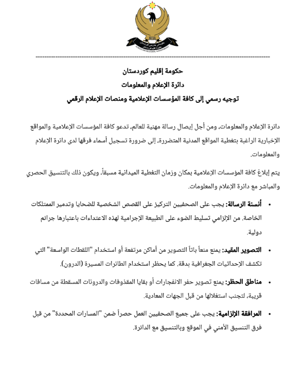 أصدرت دائرة الإعلام والمعلومات في حكومة إقليم كوردستان، اليوم الأحد (29 آذار 2026)، إرشادات جديدة لتغطية المواقع المدنية المتضررة، داعيةً المؤسسات الإعلامية، والمواقع الإخبارية الراغبة في التغطية إلى تسجيل فرقها لدى الدائرة من أجل الحصول على الموافقات المسبقة لإجراء التغطية.