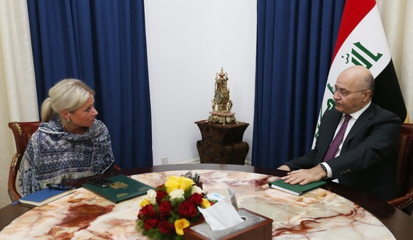 استقبل رئيس الجمهورية برهم صالح، في قصر السلام ببغداد، الممثلة الخاصة للأمين العام للأمم المتحدة في العراق جينين بلاسخارت.