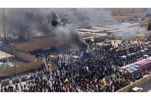 إقتحم محتجون غاضبون يتبعهم أفراد من ميليشيات الحشد الشعبي ، يحملون أعلام الحشد الشعبي وحزب الله العراقي، اليوم الثلاثاء، الباحة الخارجية للسفارة الأميركية في بغداد، بعد حرق إحدى بوابات السفارة، منددين بالضربات الجوية الأميركية التي استهدفت الأحد قواعد تابعة لكتائب حزب الله العراقي الموالي لإيران، فيما كشف مصادر مطلعة، بإجلاء موظفي السفارة الأمريكية في بغداد، حيث نقلوا إلى أربيل عبر المطار، لإبعادهم عن خطر المقتحمين للسفارة.