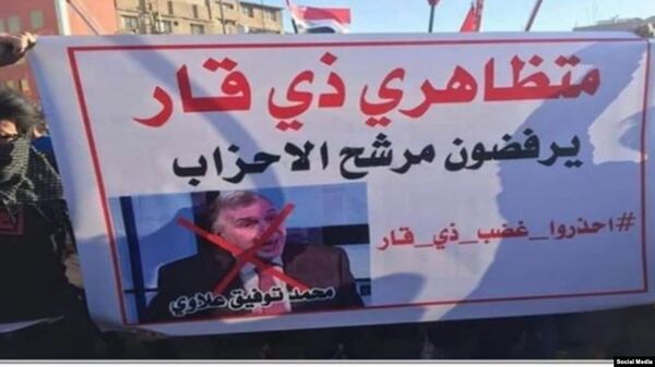 ورفع المتظاهرون في الديوانية والحلة شعارات تعتبر أن "علاوي هو مرشح المليشيات الايرانية وليس الشعب".