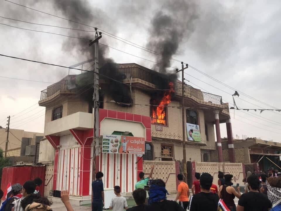 محتجون يشعلون النيران في مقر تيار الحكمة وعصائب أهل الحق