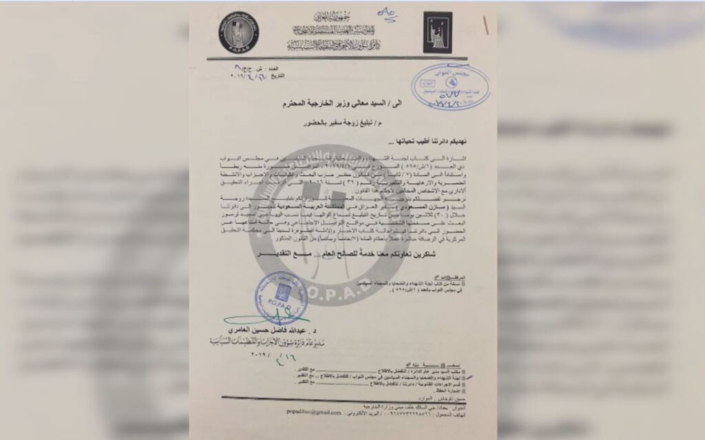 بالوثيقة.. استدعاء زوجة السفير العراقي في السعودية لتمجيدها رموز البعث