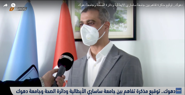 وقعت كل من الجامعة التقنية وجامعة دهوك والمديرية العامة للصحة في المحافظة، اليوم السبت (18 أيلول 2021)، مذكرة تفاهم مع جامعة ساساري ومنظمة آيسبو الإيطاليتين، لتطوير برنامج التمريض في الجامعات.